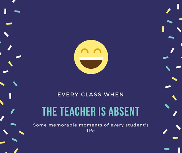 As soon as the students come to know the fact the teacher is absent, it is an enormous celebration time for them. you will see them dancing and roaring and laughing like they have been set free from cages. they will shout as if their mouths were taped since long. they will rise up on their chairs and desks like the earth has fallen short of them.